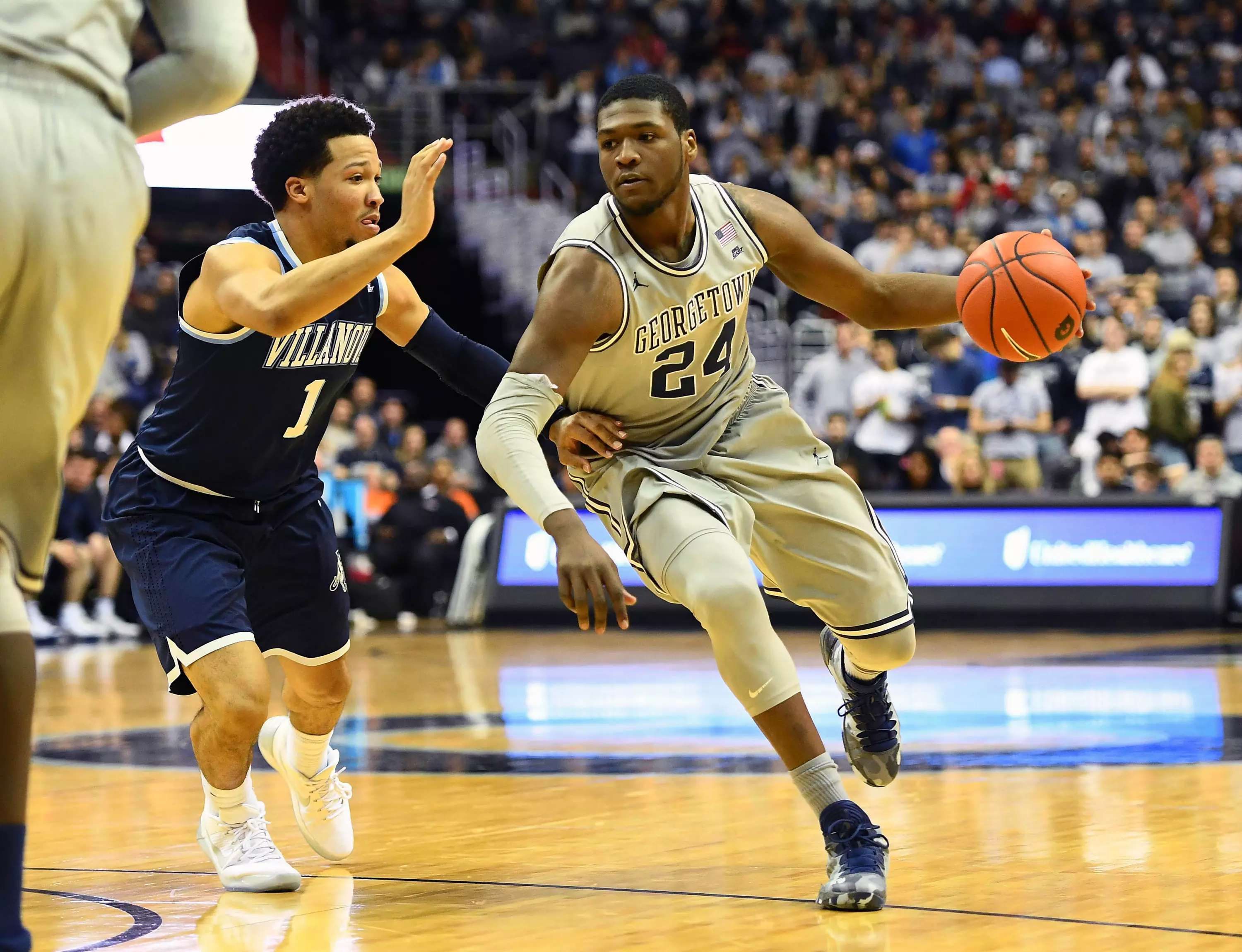 Georgetown held a 15-14 lead, but a jumper from Dante DiVincenzo gave Villanova a 16-15 lead and was part of six-straight points as the lead grew to 20-15 on a layup from Mikael Bridges. GU pulled to within three (20-17) on a 3-pointer from Pryor with 9:13 to play. A pair of free throws from junior forward Akoy Agau (Omaha, Neb./Omaha Central/Louisville) cut the VU lead to 26-20 before the Wildcats made their late run to widen the gap at the half.